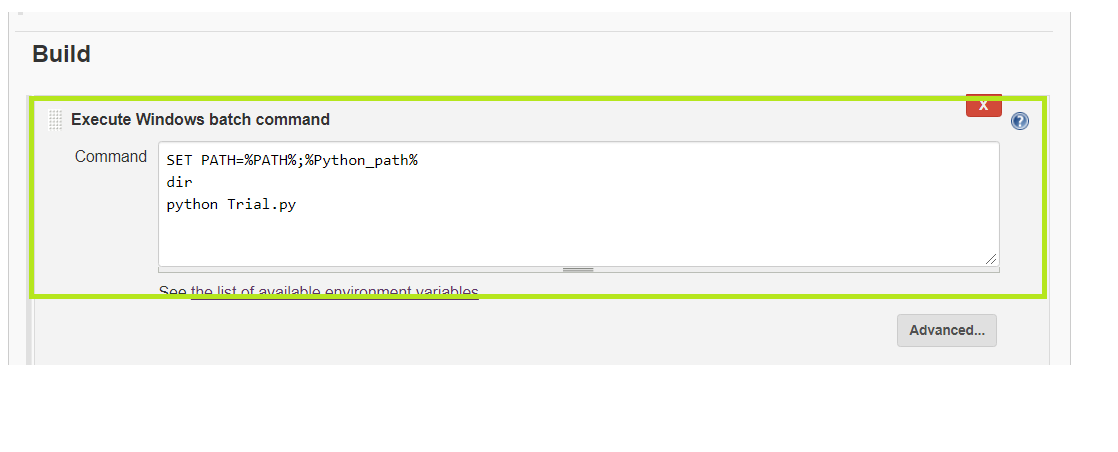 Underbuild section select Execute Windows batch command. And add the below command to set python path “SET PATH=%PATH%;%Python_path%”.